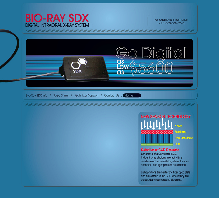Experience the Difference. Small pixel size, fiber-optic plate, and needle structure scintillator makes the Bio-Ray SDX superior in resolution and image quality. From direct digital panoramic to phosphor plate system, SDX offers a turnkey solution for all your digital imaging needs. And Bio-Ray SDX will give you the best technology available for a resonable price. Call Lloyd at 1-800-880-0240 to learn more.
